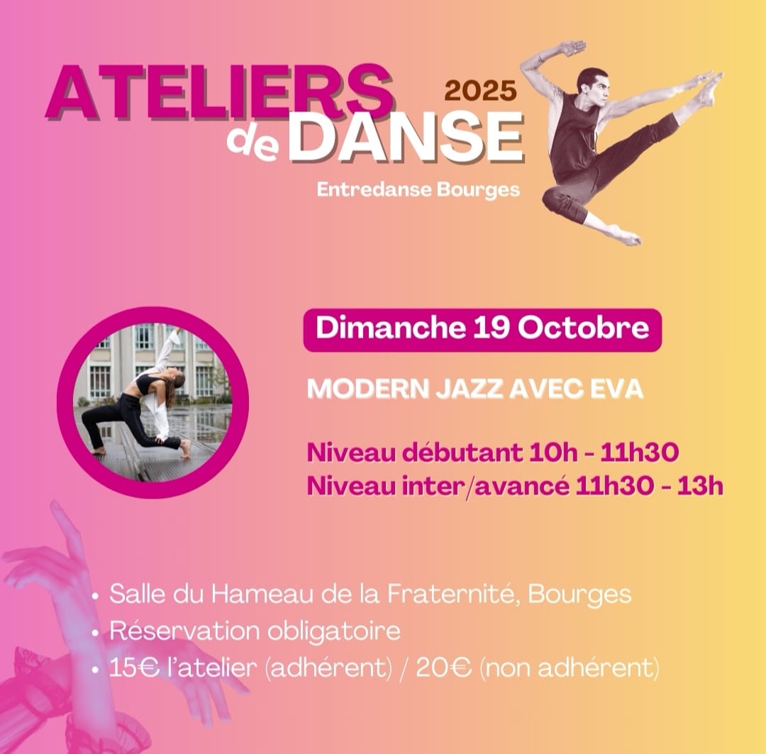 L'association Entredanse organise ce dimanche un atelier de danse modern' jazz avec EVA, pour tous niveaux ( débutant et inter-avancé ) à la salle de danse Arabesque du Hameau de la fraternité à Bourges.