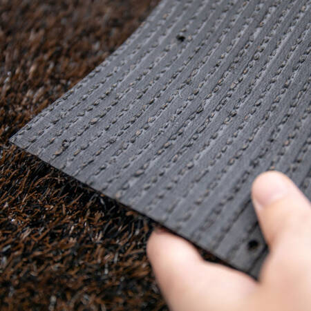 Aspect : Fibre monofilament PE droite et Fibre monofilament PP frisée Certification : GRS (Global Recycled Standard) Classement feu : Bfl-s1 (ancienne norme M3) Composition fibre : Polypropylène / Polyéthylène Contenu recyclé : 50 % Décitex (Dtex) : 4500 Densité (points ou nœuds/m²) : 24570 Dossier : Latex noir SBR (à base de styrène butadiene) + trous de drainage Épaisseur de fibre (mm) : 20 Épaisseur matière (mm) : 22 Garantie (hors chutes) : 5 ans en usage ornemental Jauge : 5/16'' Perméabilité à l'eau : 60 L/m²/min soit 3600 L/m²/h Poids de fibre (g/m²) : 560 Poids total (g/m²) : 1480 Serrage : 190 points/ml Solidité à la lumière : traité contre les UV Solidité des couleurs : Xenon test: Blue-scale > 7, Grey-scale > 4 Stabilité aux UV : ± 6000 heures (DIN 53387) Type : Tuftées Usage : Stand, foire, scénographie, événementiel, terrasse, balcon