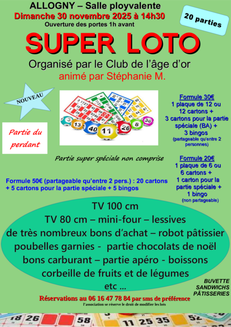 Je vous adresse l'affiche pour l'organisation d'un loto par le club de l'âge d'or , qui aura lieu le 30 novembre 2025 à la salle l'heure bleue Allogny 18110.