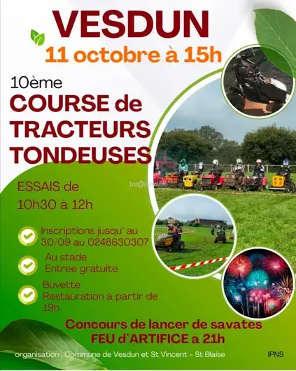 Au programme : Des bolides tondeuses transformés pour la vitesse et le fun, les essais entre 10h30et 12h et début des courses à 15h, une ambiance familiale et conviviale, concours de lancer de savates, buvette et restauration à partir de 19h, suivi du feu d’artifice à 21h.