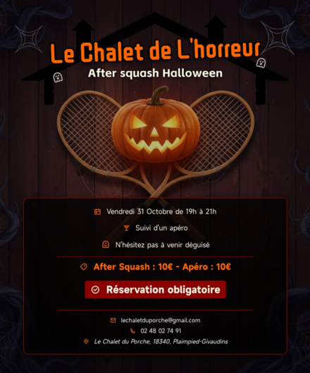 Rejoignez-nous pour un After où vous pratiquerez le squash avec d'autres personnes de 19h à 21h au Chalet du Porche, ambiance horreur et petit apéritif à la fin.