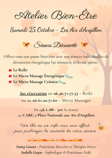 Réservation obligatoire : - Micro Massage : 06.61.20.71.60 - Reiki : 06.46.71.77.33