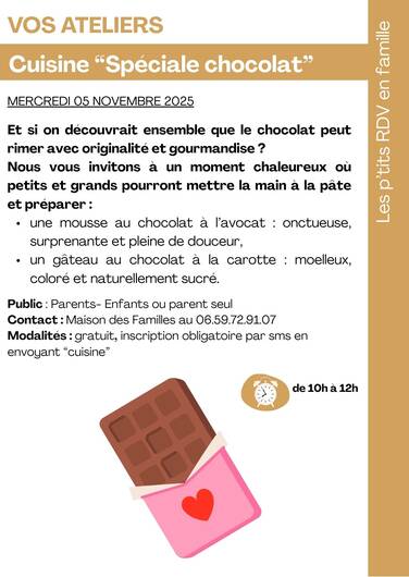 Et si le chocolat se mariait avec l’avocat ou la carotte ? Venez en famille découvrir deux recettes originales et gourmandes lors d’un atelier plein de douceur !