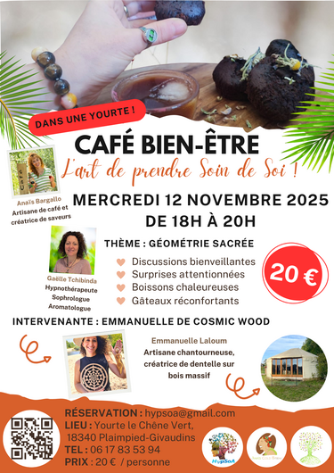 Pour cette intervention, Emmanuelle de "Cosmic Wood" vous délivrera une partie des secrets du sacré ! Autour de cocktails sans alcool, de douceurs saines et d’une atmosphère chaleureuse, venez vivre l’Art de prendre soin de soi… naturellement.