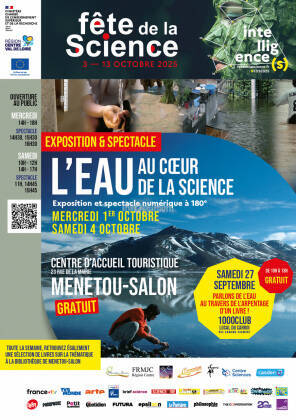 Rendez-vous les mercredi 1er et samedi 4 octobre à Menetou-Salon au Centre d'accueil touristique (23 rue de la Mairie) pour découvrir "L’eau au cœur de la science", une exposition interactive et des projections numériques immersives gratuites, accessibles à tous. Une sortie ludique et pédagogique à vivre pour mieux comprendre les enjeux de l’eau !