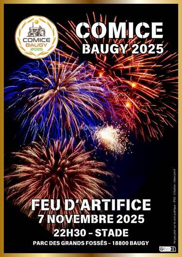 En raison des conditions climatiques et de la canicule du mois d'août, le feu d'artifice du Comice de Baugy 2025 sera tiré le vendredi 7 novembre 2025 à 22h30, au stade de football de Baugy.