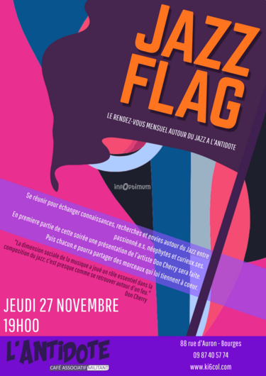 Au rendez-vous de novembre de Jazz Flag, une nouveauté : la soirée commencera par une présentation de l'artiste Don Cherry (1936/1995). Trompettiste connu pour ses associations avec divers musiciens, notamment divers saxophonistes (Ornette Colemann, Albert Ayler, Sonny Rollins, Archie Shepp), Don Cherry, les joues gonflées par sa trompette de poche, prouve qu'on peut faire beaucoup de bruit avec un petit instrument. Pionnier du free jazz, puis artisan d'une musique ouverte à toutes les influences, de la world au rock et même à l'électro., le musicien expérimentera jusqu'à sa mort en incluant dans ses morceaux des mélanges de bebop teinté de musique venant du Moyen-Orient, d'Afrique, d'Inde....