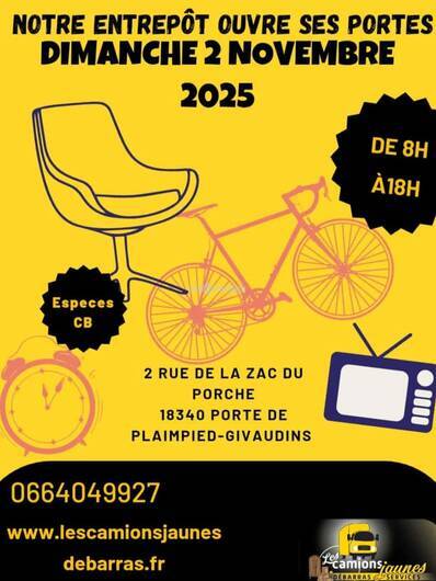 LES CAMIONS JAUNES DÉBARRAS SERVICES ouvre leur entrepôt de vente situé au 2, rue ZAC du Porche – 18340 Plaimpied-Givaudins. Une fois par mois, ils proposeront une sélection d’objets revalorisés issus des débarras réalisés par leur équipe. L’occasion de donner une seconde vie à une multitude d’articles : mobilier, bricolage, décoration, miroirs, vaisselle, bibelots, petits électroménagers, livres, friperie, et bien plus encore !