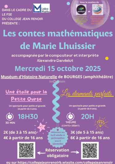 Le Laboratoire de Maths du Collège Jean Renoir de Bourges a le plaisir d’accueillir Marie Lhuissier, conteuse scientifique accompagnée par son musicien Alexandre Dandelot mercredi 15 et jeudi 16 octobre 2025 au Muséum d’histoire Naturelle de Bourges.