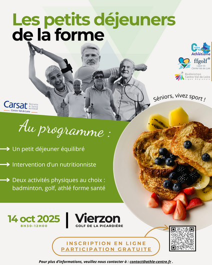 La ligue du Centre-Val de Loire d'athlétisme organise avec le concours de la CARSAT, la ligue de golf et de badminton les « petits déjeuners de la forme» le mardi 14 octobre au golf de Vierzon. Cette opération consiste à aider les participants à réaliser un petit-déjeuner équilibré.