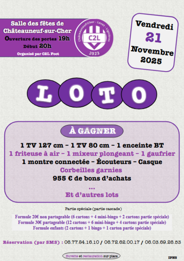 Loto organisé par C2L Foot à la salle des fêtes de Châteauneuf sur Cher.