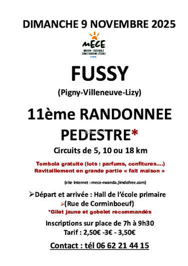 Départ et inscriptions de 7h à 9h30 dans le hall de l'école primaire de Fussy, rue de Corminboeuf - pot de l'amitié à l'arrivée, tombola par tirage au sort des tickets d'inscription mais aussi un panier bio à gagner.