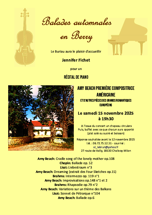 Le Buriau aura le plaisir d'accueillir Jennifer Fichet pour un Récital de piano: Amy Beach première compositrice américaine et d’autres pièces des grands romantiques européens (Chopin, Brahms, Liszt) le samedi 15 novembre 2025 à 19h30