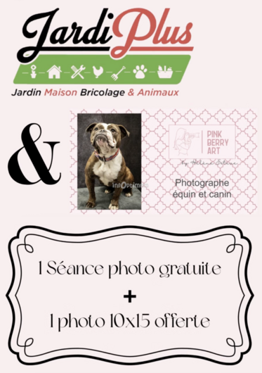 Le Vendredi 3 et le Samedi 4 Octobre, en partenariat avec Pink Berry Art, par Hélène Esteve, photographe animalière, venez immortaliser un moment avec votre boule de poil préférée. Dès maintenant, réservez votre séance et bénéficier d'une photo 10X15 offerte (sans obligation d'achat) et de 10% de remise sur les tarifs des autres formats.