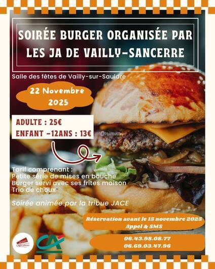 Le samedi 22 novembre a partir de 19h30 les jeunes agriculteurs du canton JA Sancerre Vailly organisent leur traditionnel soirée burger fait maison avec des produits locaux