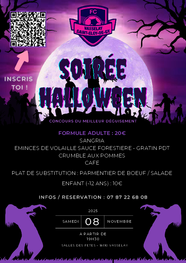 Merci de vous inscrire par le lien suivant : https://www.helloasso.com/associations/football-club-vasselay-saint-eloy-de-gy/evenements/soiree-halloween ou en flashant le QR code sur l'affiche !