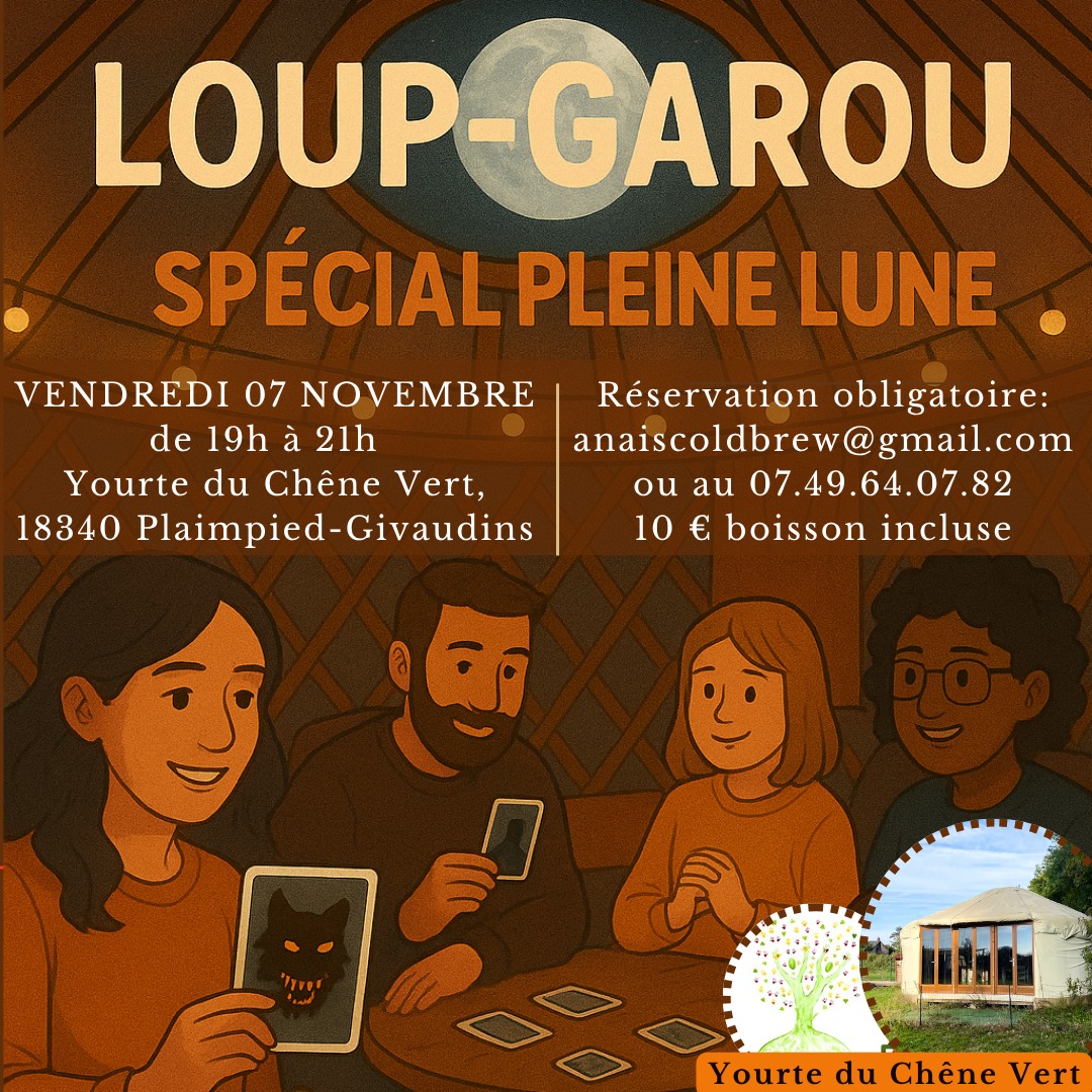 Dans le cadre cocooning la yourte du chêne vert, ambiance plaid, coussins et petites lumières, vient passer une soirée détente autour du jeu immersif "Loup-garou". Ambiance garantie, boissons artisanales de bienvenue par Anaïs Cold Brew et rires au rendez-vous.