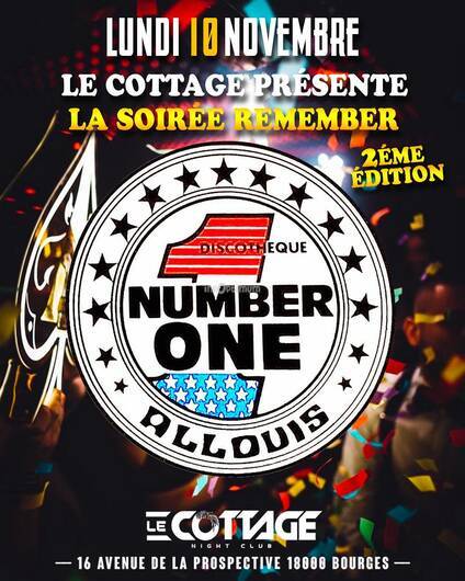 La discothèque LE COTTAGE, situé au 16 avenue de la prospective, 18000 Bourges, a le plaisir de vous faire partager et de vous présenter (pour sa 2eme édition) la soirée Remember du NUMBER ONE.