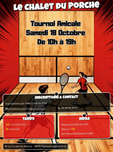 Le Chalet du Porche organise un Tournoi Amicale de Squash Samedi 18 Octobre de 10h à 19h.