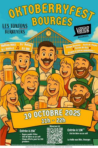 Le dimanche 19 octobre 2025, nos amis de Vandb Saint Doulchard & VandB Bourges transforment la Halle au Blé en véritable Oktoberfest version berruyère : l’Oktoberryfest !! Au programme : ambiance bavaroise, bières, concerts live, DJs et convivialité XXL. Bonne humeur garantie avec une atmosphère festive rythmée par la musique et la danse. Pour profiter pleinement de la soirée, la tenue bavaroise est vivement conseillée !