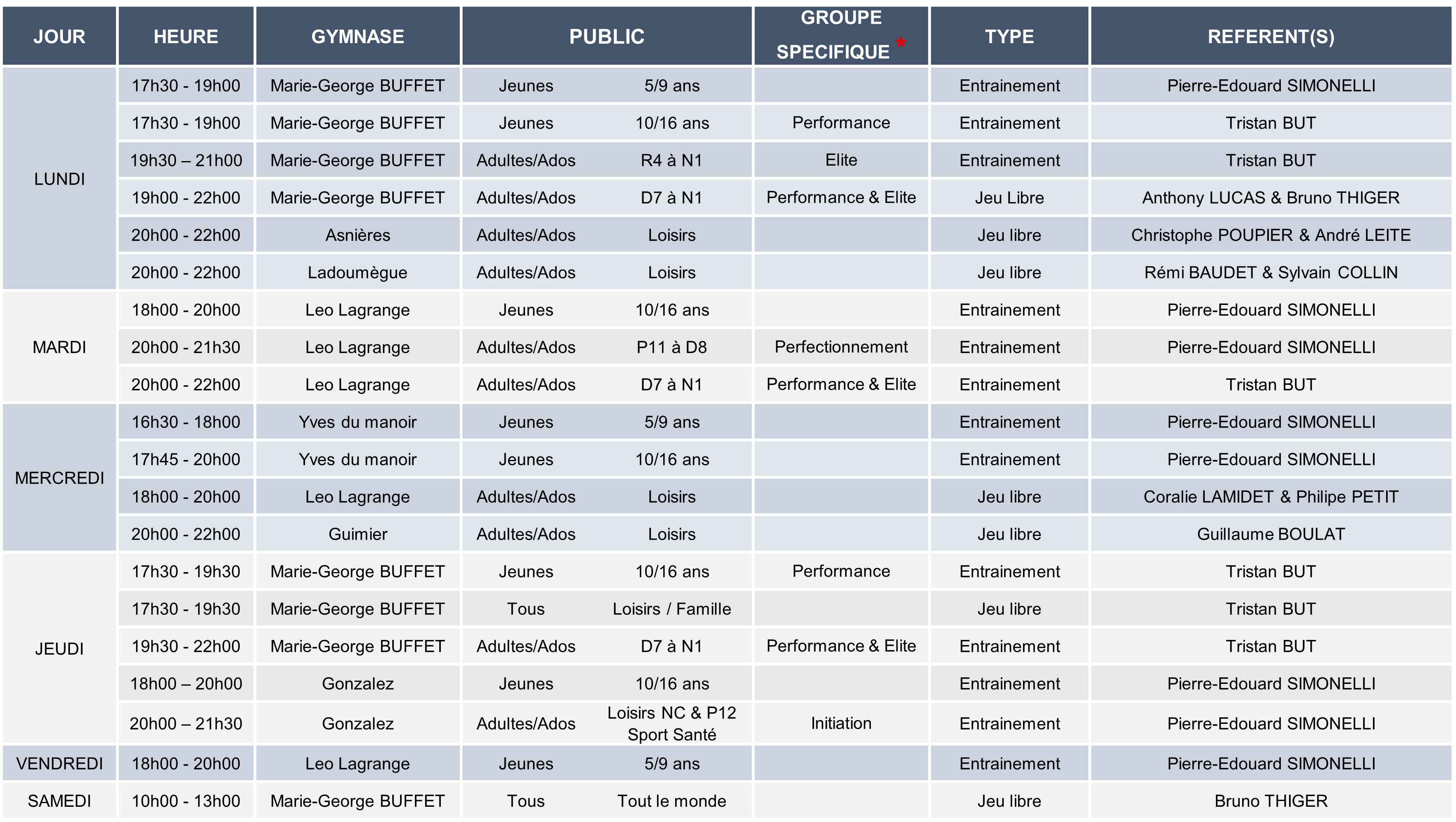 LISTE DES CRÉNEAUX 2025/26